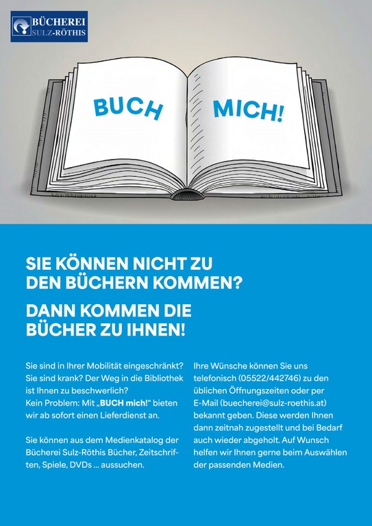 Über die Bücherei-Homepage buecherei-sulz-roethis.at werden sämtliche Aktionen und Veranstaltungen laufend veröffentlicht. Seit diesem Jahr wird ergänzend auch die Gemeindeplattform „Cities“ regelmäßig zur Information der Bevölkerung genutzt.