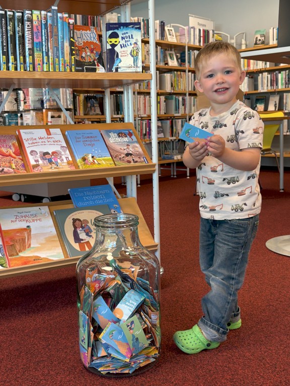 Jakob, der heuer die fünf Lesepässe aus dem Gewinnspielglas ziehen durfte, hatte sehr viel Spaß bei dieser aufregenden Aufgabe.