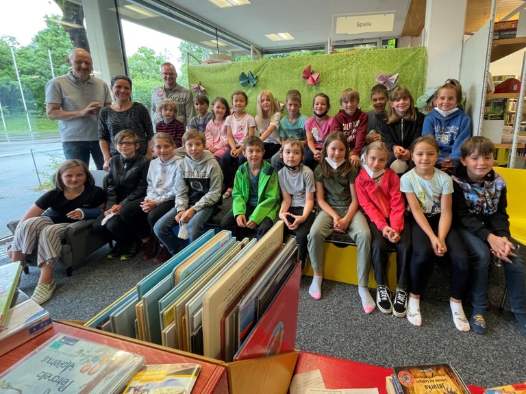 - Trotz mehrerer coronabedingter Lockdowns besuchten die Kinder der VS Viktorsberg mit Direktor Daniel Amann und Klassenlehrerin Astrid Gredig regelmäßig unsere Bücherei.