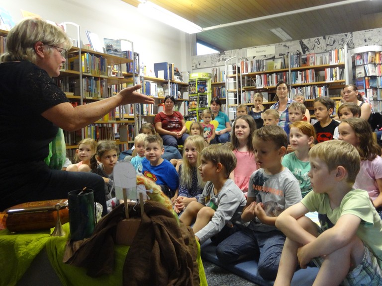 Am Freitagnachmittag, den 8.6.2018 strömten zahlreiche kleine und große Märchenfans in die Bücherei Sulz-Röthis. Durch einen Vorhang betraten sie den Raum der phantastischen Geschichten. Dort ließ die Märchenerzählerin Anna Hutter die Welt von Zwergen, Riesen, Prinzessinnen und anderen märchenhaften Gestalten lebendig werden. Sie erzählte und sang mit den Kindern, die ihren Geschichten gespannt folgten. Zum Abschluss der schönen Stunde gab es für jede/n Besucher/in zur Erinnerung einen selbstgebastelten Zwergenanhänger.