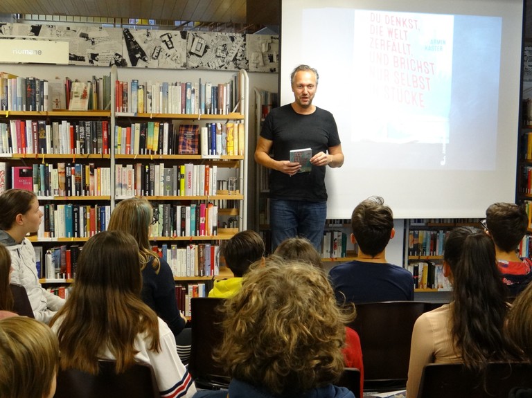 Dem in Düsseldorf lebenden Autor liegen Themen, die die Jugendlichen beschäftigen, ganz besonders am Herzen. Mit seinem Buch „Du denkst, die Welt zerfällt, und brichst nur selbst in Stücke“ fesselte er die Schülerinnen und Schüler. Diese nutzten im Anschluss an die Lesung die Chance, Armin Kaster zu den verschiedensten Themen zu befragen. Es war für alle Beteiligten eine beeindruckende Lese- und Gedankenreise.