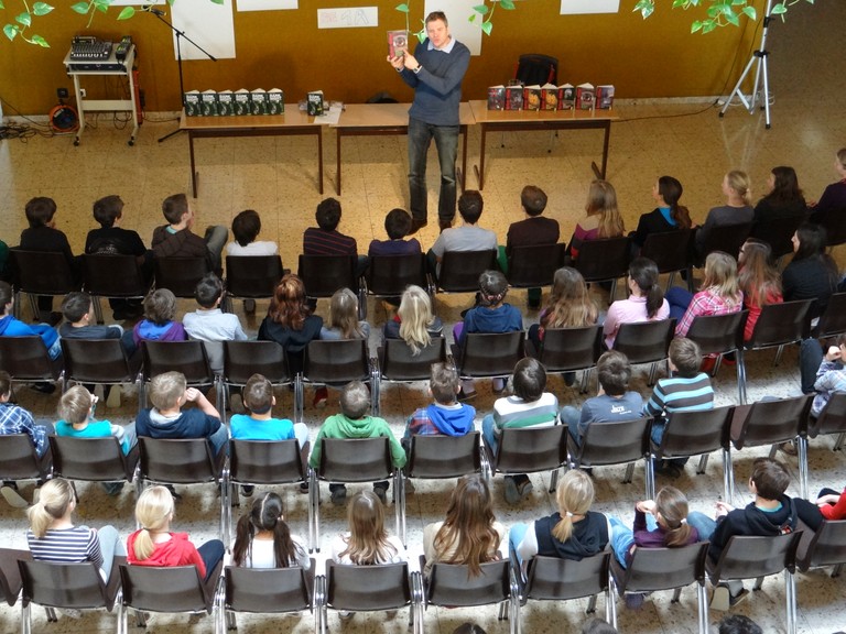Am Donnerstag, den 14. Februar 2013 hielt er in der Aula unserer Mittelschule zwei Lesungen für insgesamt 140 SchülerInnen, die begeistert zuhörten. Zunächst stellte er sich vor und präsentierte eine Auswahl seiner Bücher. Im Anschluss an eine spannende Lesestelle ging es darum, eine Quizfrage zu beantworten. Die Gewinner erhielten je ein von Martin Selle signiertes Buch.