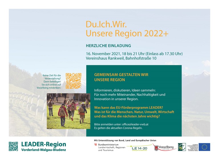 Du.Ich.Wir.Unsere Region 2022+ Sehr herzlich laden wir Sie ein zur öffentlichen Bürgerveranstaltung am 16. November 2021 im Vereinshaus Rankweil: Informieren, diskutieren, Ideen sammeln: Für noch mehr Miteinander, Nachhaltigkeit und Innovation in unserer Region.