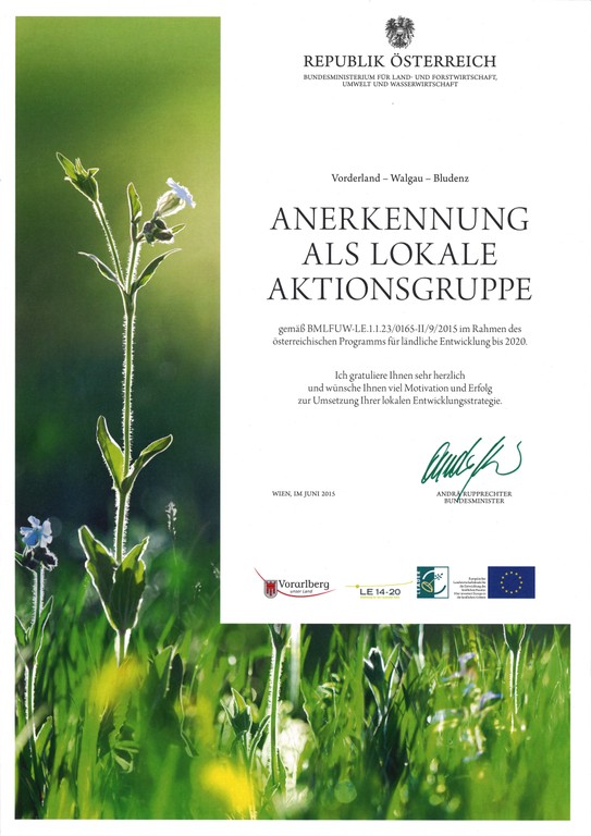 Die offizielle Anerkennung der LEADER-Region durch das BMLFUW fand in Wien statt. Dabei wurden durch Bundesminister Andrä Rupprechter in feierlichem Rahmen Urkunden an insgesamt 77 LEADER-Regionen in ganz Österreich überreicht.