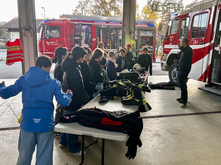 Im Anschluss wurde die Schülergruppe in zwei Teams aufgeteilt, eine Gruppe besuchte das Feuerwehrhaus Sulz, wo die Einsatzfahrzeuge und deren Ausrüstung vorgestellt wurden. Die zweite Gruppe blieb im Feuerwehrhaus Röthis und erhielt dort Einblicke in die persönliche Schutzausrüstung und das Atemschutzgerät. Danach durften die Schülerinnen und Schüler selbst aktiv werden und mithilfe von Hebekissen eine unter einem Fahrzeug eingeklemmte Person befreien, eine eindrucksvolle Demonstration der technischen Möglichkeiten der Feuerwehr.