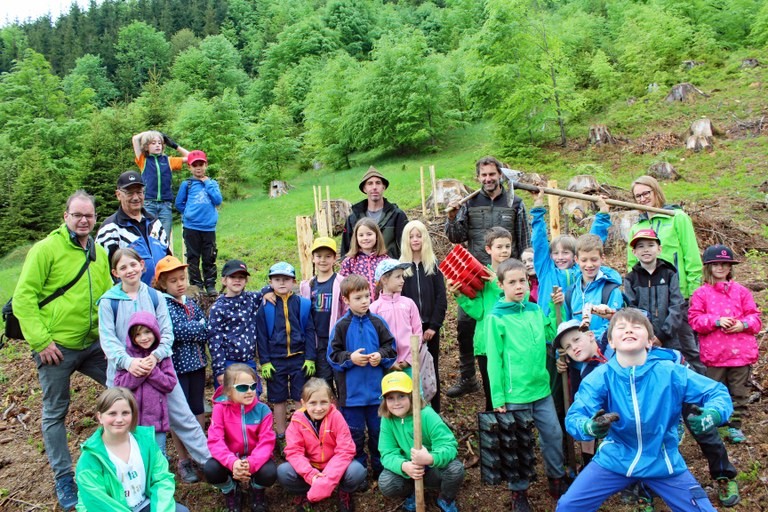 Vorab waren die Themen Klimawandel und nachhaltige Forstwirtschaft bereits im Unterricht behandelt worden. Unter fachkundiger Anleitung von Waldaufseher Christoph Khüny und Gemeindearbeiter Alfons Marte pflanzten die Schüler*Innen 150 Fichten, Weißtannen, Lärchen, Ahorne, Vogelkirschen und sogar vier Apfelbäumchen für einen vielfältigen Wald der Zukunft. Bürgermeister Philibert Ellensohn hatte sichtlich Freude an der Aktion und legte tatkräftig mit Hand an.