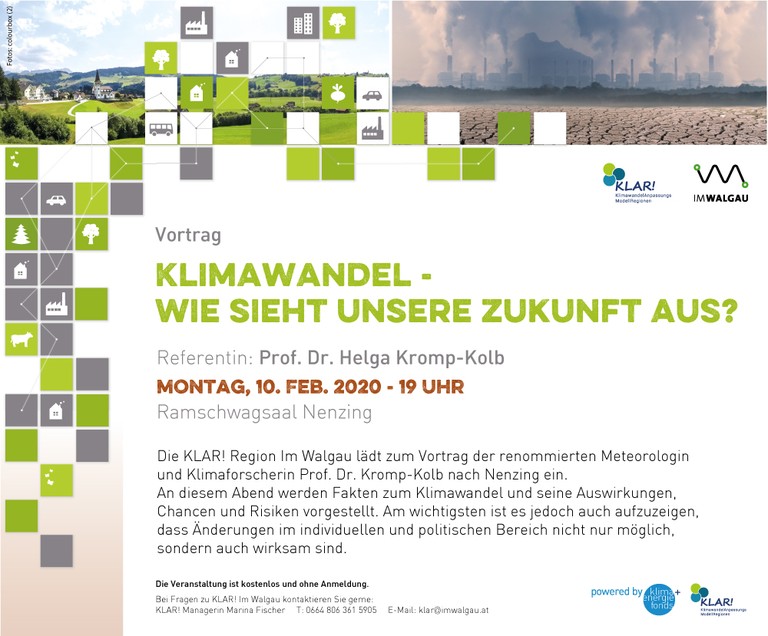 Die KLAR! Region Im Walgau lädt zum Vortrag der renommierten Meteorologin und Klimaforscherin Prof. Dr. Kromp-Kolb nach Nenzing ein. An diesem Abend werden Fakten zum Klimawandel und seine Auswirkungen, Chancen und Risiken vorgestellt. Am wichtigsten ist es jedoch auch aufzuzeigen, dass Änderungen im individuellen und politischen Bereich nicht nur möglich, sondern auch wirksam sind.