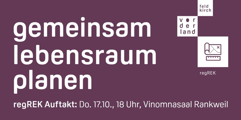 - Die Regio Vorderland-Feldkirch lädt die Bürgerinnen und Bürger zum öffentlichen regREK-Auftakt ein: Am Donnerstag, 17. Oktober 2019 werden im Rankweiler Vinomnasaal ab 18 Uhr Umfrageer-gebnisse, Analysen sowie eine Ausstellung alter Fotos und Karten präsentiert. Die Teilnehmenden sind aufgerufen, ihre Ideen für die Entwicklung der Region einzubringen.