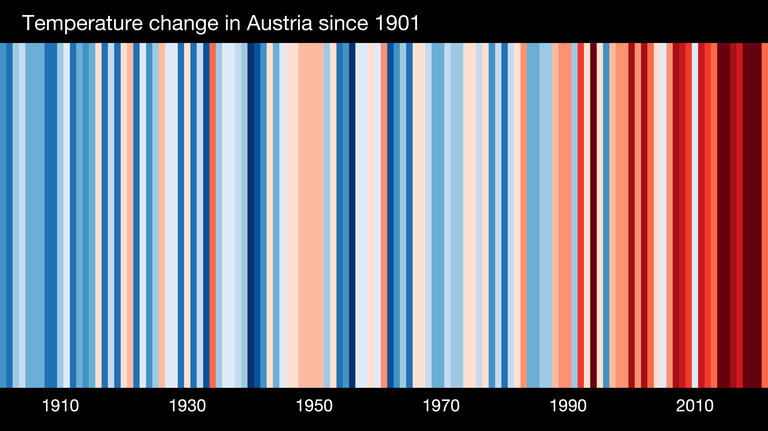 Das Streifendiagramm (Quelle: https://showyourstripes.info/l/europe/austria/all) zeigt die Entwicklung des Jahresdurchschnittstemperatur in Österreich seit 1901. In den vergangenen Jahrzehnten ist die Durchschnitttemperatur in ganz Österreich und somit auch in Vorarlberg und in der Region Vorderland-Feldkirch markant angestiegen. In den letzten zehn Jahren hat sich dieser Trend weiter beschleunigt.